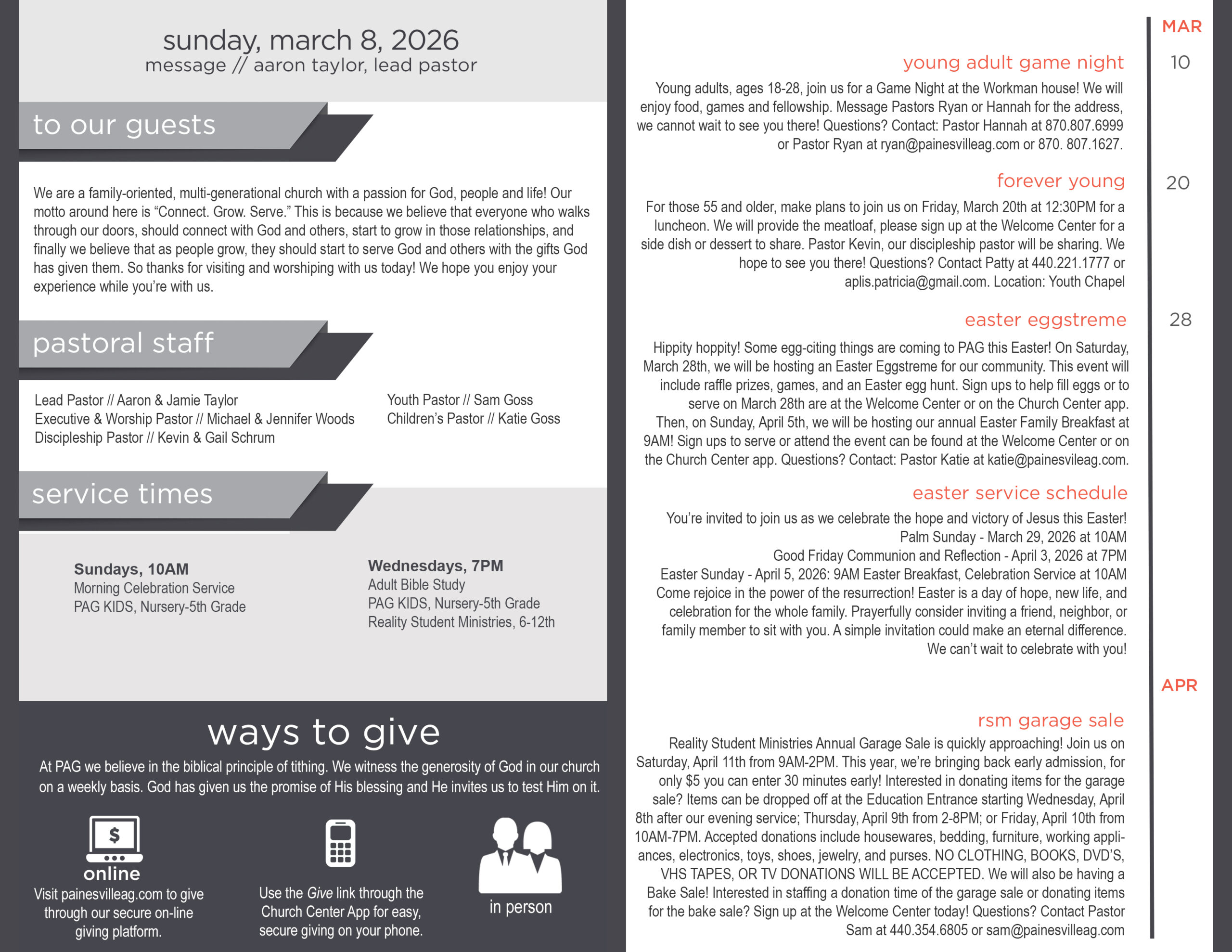 We are a family-oriented, multi-generational church with a passion for God, people and life! We hope you will join us for one of our services soon! Our motto around here is “Connect. Grow. Serve.” That is because we believe that everyone who walks through our doors, should connect with God and others, should start to grow in those relationships, and finally we believe that as people grow, they should start to serve God and others with the gifts that they have.